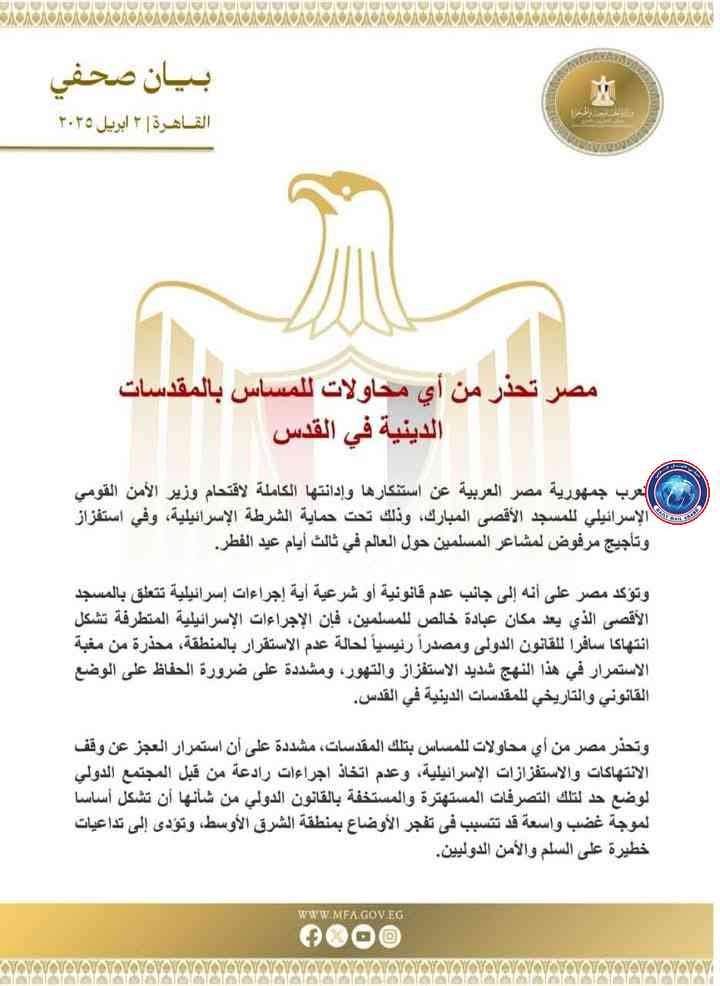 كتب.محمد محمود تعرب جمهورية مصر العربية عن استنكارها وإدانتها الكاملة لاقتحام وزير الأمن القومي الإسرائيلي…