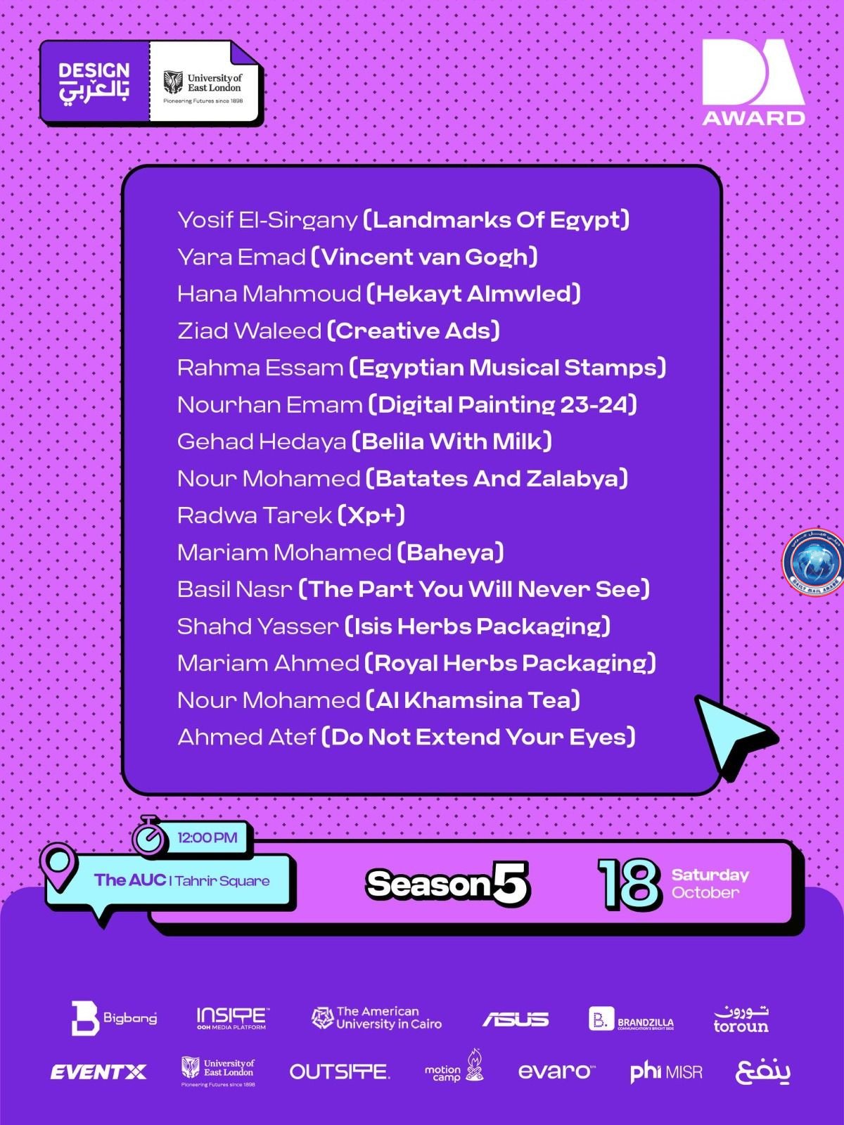 وقد جاءت مشاركات طلاب قسم الإعلان والإعلان الرقمي لتعكس تنوع الفكر والرؤية الفنية المبتكرة، حيث شارك كل من رضوى طارق قسم إعلان، وأميرة قسم إعلان، وزياد وليد الفرقة الثانية، إعلان رقمي، الذين قدموا أعمالًا عكست وعيًا فنيًا معاصرًا وقدرة على توظيف أدوات التصميم الجرافيكي في التعبير عن أفكار إبداعية ذات طابع عربي مميز.